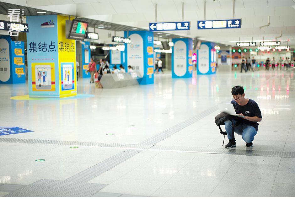 有时候,进了地铁也不意味着下班。晚上10点,一位在西二旗地铁站就地办公的小哥。