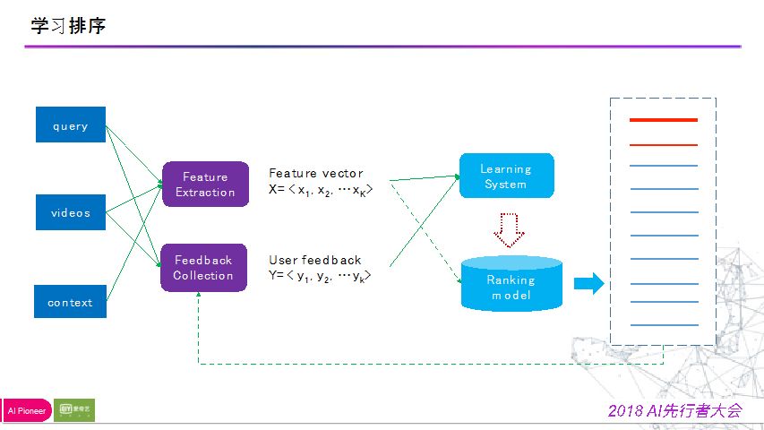 所以后面迁移到了学习系统,基于用户在历史的排序结果的点击行为收集起来构造label,根据用户在搜索时候给出的query以及展现给用户的video以及上下文信息构造特征向量,与label进行join,得到ground turth,之后进入学习系统进行学习,训练处一个排序模型,就可以对数据进行预测排序。