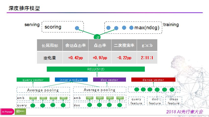 底层是query和document的一些描述文本做多粒度切词,之后做embedding然后做加权平均,得到document和query的向量表达,拼接这两组向量,同时再做点积,(两个向量越来越相近,拼接的时候希望上层网络学到两个向量的相似性,需要有足够的样本和正负样例,所以我们自己做了点积),同时用稠密特征,即在gbdt中用到的特征抽取出来,与embedding特征做拼接,最后经过三个全连接层,接sigmoid函数,就可以得到样本的score,并在此基础上用ndcg的衡量标准去计算损失,从而反向优化网络结构。
