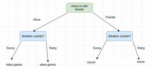 在现实生活中,我们常常用过类似于决策树的方式来决定自己的生活。例如,决定周末安排什么样的活动。采取怎样的活动可能取决于一些因素,比如是否愿意和朋友一起出去或独自度过周末、周末的天气如何等。假设就这两个因素影响你做出决定的话,如果天气晴朗,并且你的朋友可以一起参与,那么你可能想踢足球。如果是下雨天,可能会一起去看电影。如果朋友有事无法参加,那么无论天气如何,可能会去看会书、玩会电子游戏。