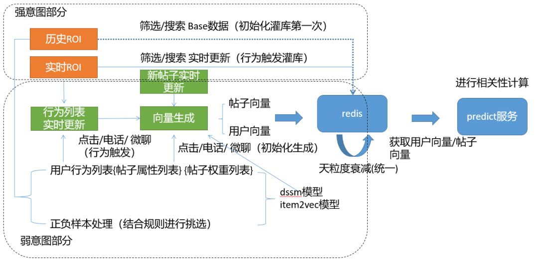 这里强意图部分我们采用了一个线性加权的方式,其中X:θ1w1 + θ2w2 +...+ θi*wi(当前帖子的属性在用户历史筛选/搜索行为中的加权和,其中θi:1/sqrt(1+dayi)(当前属性的时间衰减因子),wi:1 (当前属性的权重,第一版中都暂定为1)),将输出结果使用sigmod函数进行归一化;弱意图部分采用用户向量和帖子向量的余弦距离,这里计算用户向量和帖子向量,使用的模型有dssm[2](深度语义匹配模型)和item2vec[3]模型。用户向量和帖子向量简要数据处理流程请见下图: