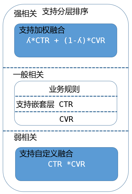基础版的排序中,只支持单因子(CTR/CVR/相关性等)排序,在部分业务线的某些商业产品中,需要同时考虑到CTR,CVR,相关性以及一些业务规则,例如房产上的视频/安选房源加权,二手车上的真车加权等等,支持多个因子的融合需要在排序机制层面进行升级。