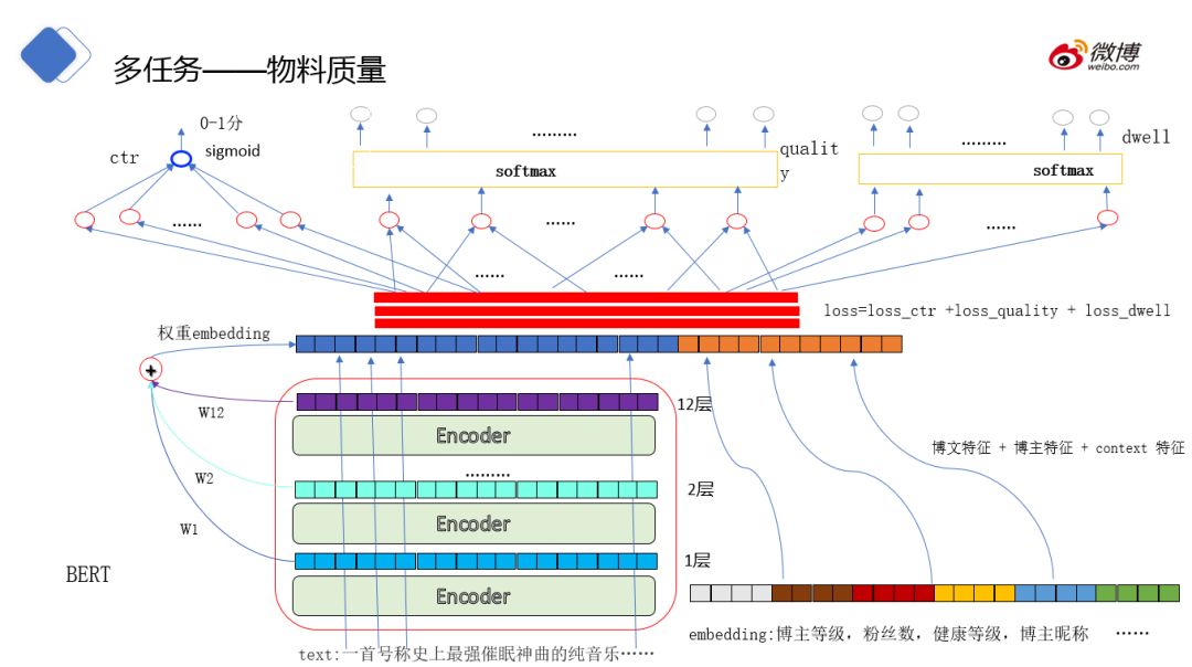 目前分类系统使用 fasttext+bert 结合的方案,是由于 bert 效果好,而 fasttext 性能好。我们有如下的方案:针对关注度高 ( 明星 ) 和高质量的博文使用 bert,其他的博文先过一遍 fasttext,若标签得分高于阀值 ( 95分 ),则不再使用 bert 进行处理;若最高得分只有70分,那么使用 bert 再预测一次。Bert 是一种多层的编码器,最近的研究表明,bert 不同层的 embedding 捕获到了不同的句子知识。比如底层 embedding 捕获到词法方面特征,中间层 embedding 捕获到句法特征,高层 embedding 捕获到语义特征。因此,我们对 bert 的结构做了优化,使用对各层 embedding 加权后获得的 embedding 作为整个博文的表征,后续的博文质量模型也是这种做法。