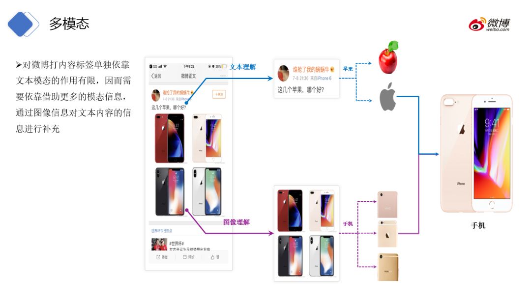 博文中出现了苹果,可能指代吃的苹果或者苹果公司。若借助图像可一目了然去除歧义。