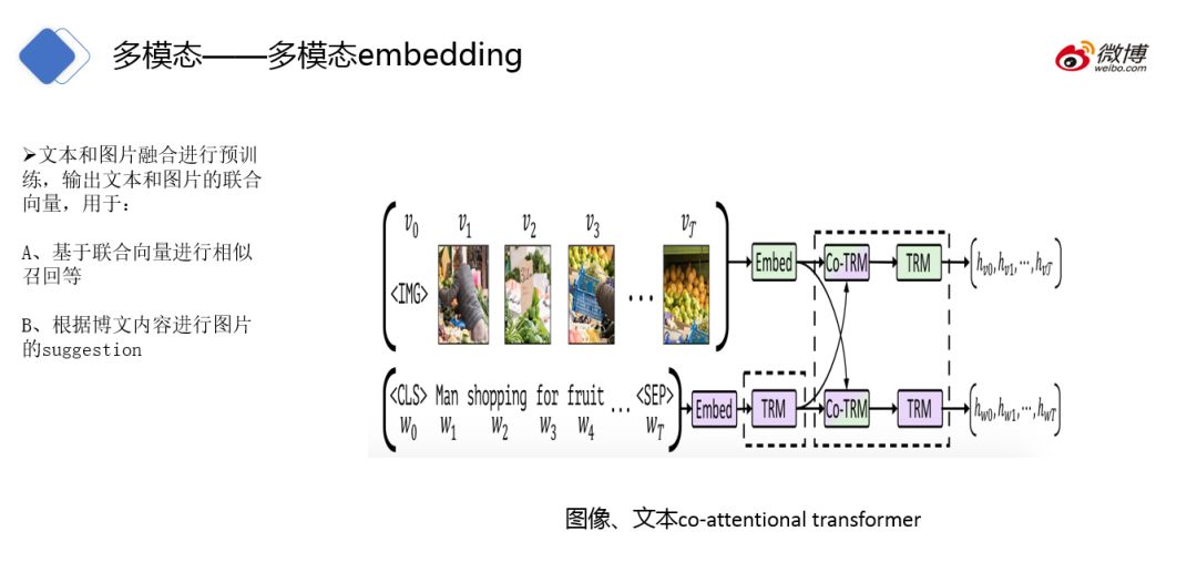 文本和图片的向量融合再进行预训练,输出文本和图片的联合向量 。联合向量可用于相似博文的召回和根据博文内容来检索相似图片 ( 自动配图 )。