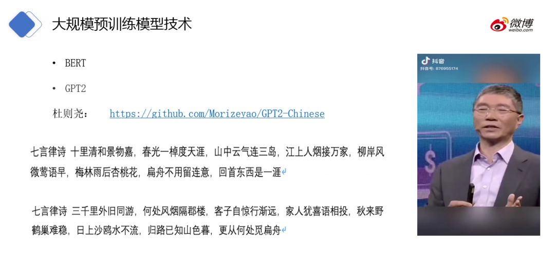 有以下两种模型:BERT 和 GPT2,而这两种模型是有区别的。BERT 主要做编码,对文本进行理解。GPT2 则为做生成任务,可辅助写作。杜则尧同学开源了基于中文的 GPT2 模型: