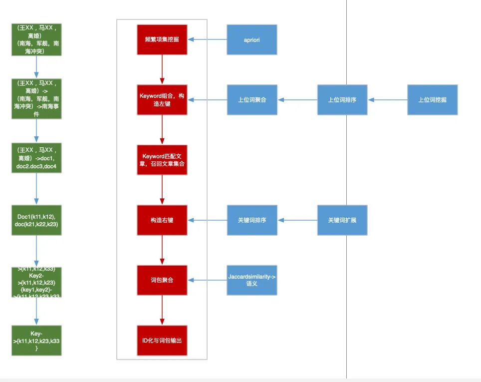 我们使用lightlda构建了1千/1万/10万不同维度的topic模型,来解决分类和tag语义粒度跨度太大问题,同时我们还区分长期topic和时效topic,时效topic用于快速发现热点事件以及提升其分发效率。我们构建了面向新闻的实时topic理解模型,支持小时级全量topic和分钟级增量topic理解,能够快速捕捉热点及进行跟进,模型流程如下。